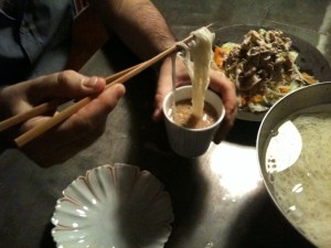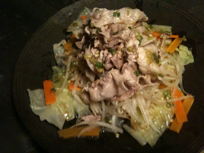 the side dish is shabu shabu salad, which is boiled pork slices (served cold) with steamed vegetables (cabbage, carrots and bean sprouts). actually, you can use many other types of vegetables for this, such as japanese radish, iceberg lettuce, broccoli, tomatoes, etc.. its name “shabu shabu” is coming from one of the japanese onomatopoeia – you pick a thin slice of meat (usually beef) with your chopsticks, stick the meat in boiled water in a big pot in front of you. gently move your chopsticks twice or so, and the meat is ready – this movement itself, apparently, sounds like “shabu shabu.”