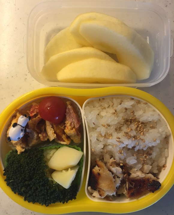[…] Lightly fried sausage, Nira (garlic chives) omelet, Boiled okra, Grilled cod marinated in saikyo-miso, Steamed carrot slices, Rice Apple bunnies for […]