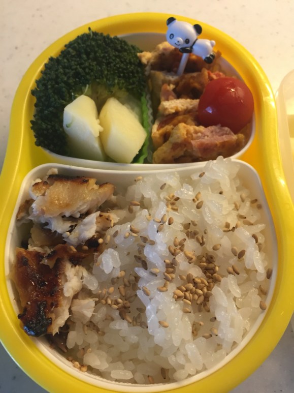 […] Grilled Japanese “mutsu” fish in saikyo miso marinade, Boiled egg, Cucumber/tomato/corn salad, Steamed broccoli and Rice, Banana & Apple […]