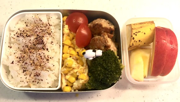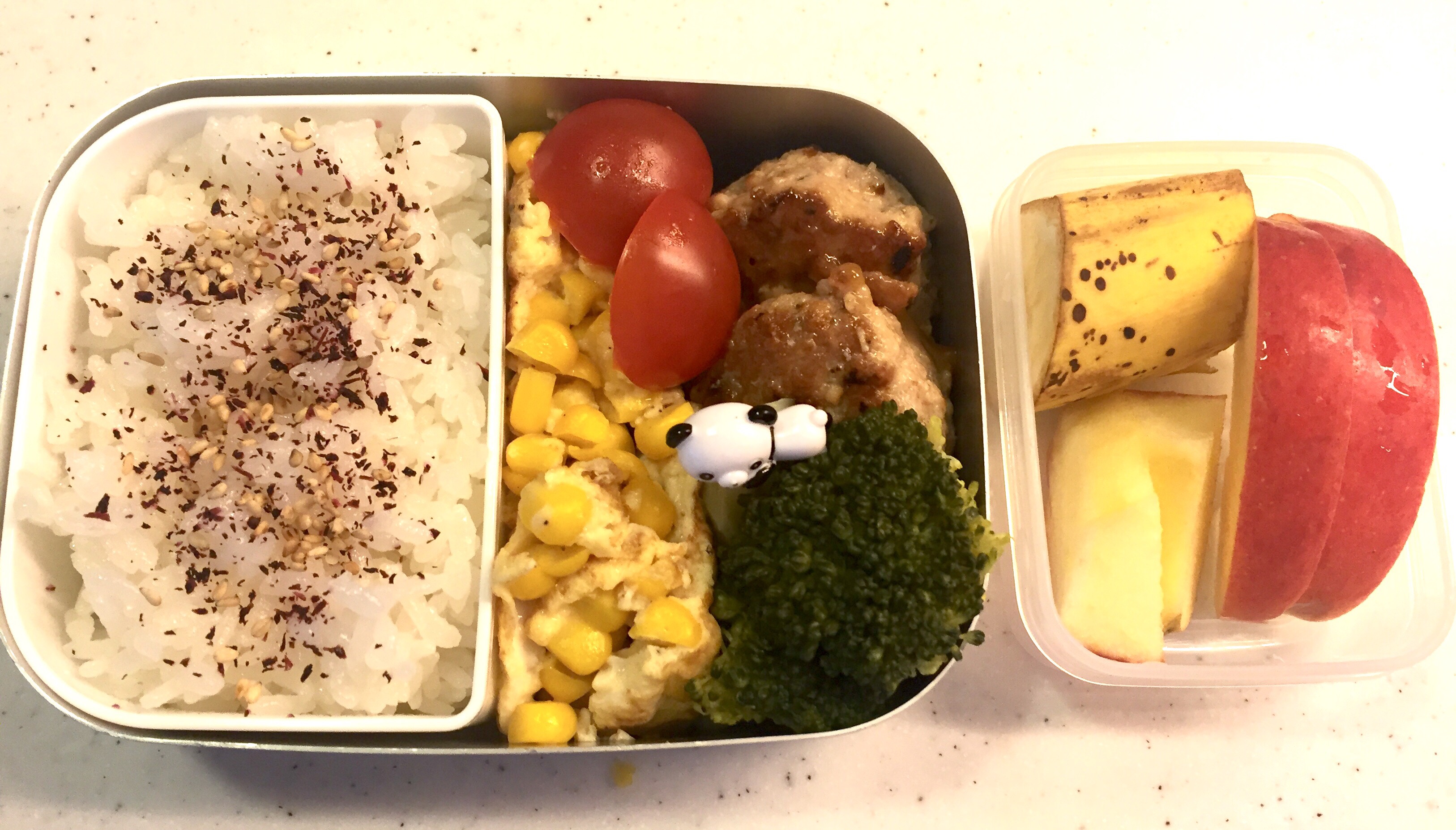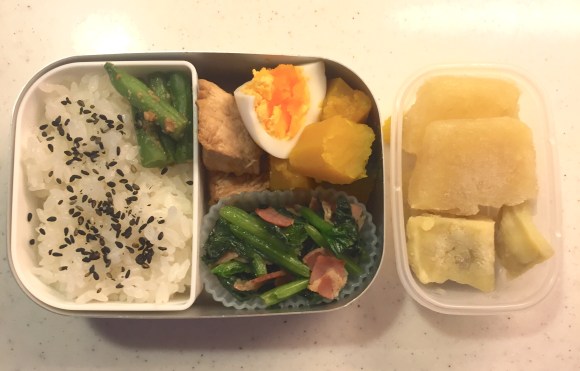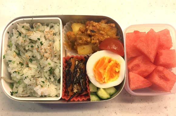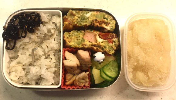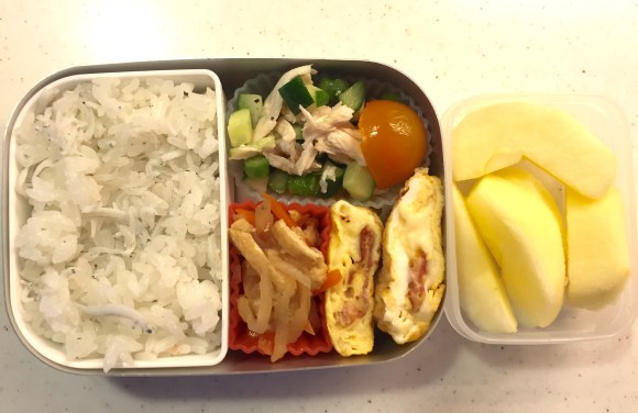 Menu: Kiriboshi daikon, Cucumber/asparagus/chicken fillet salad, Pancetta & cheese omelet, and Shirasu rice (with nori seaweed laid out in between)