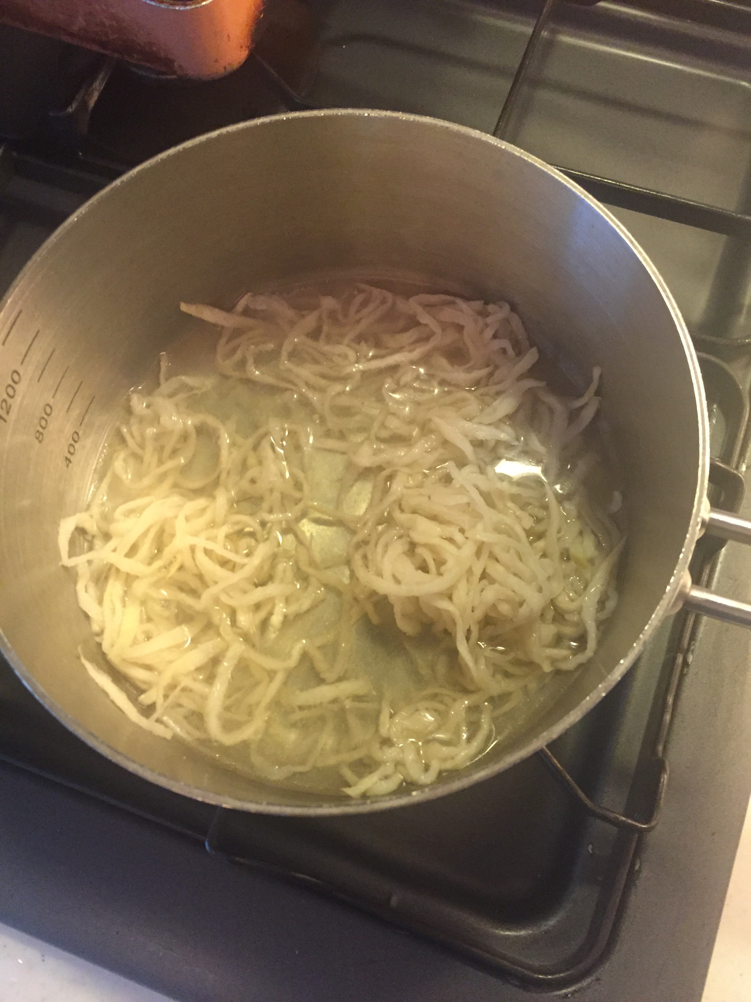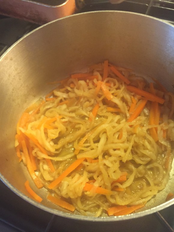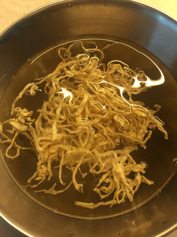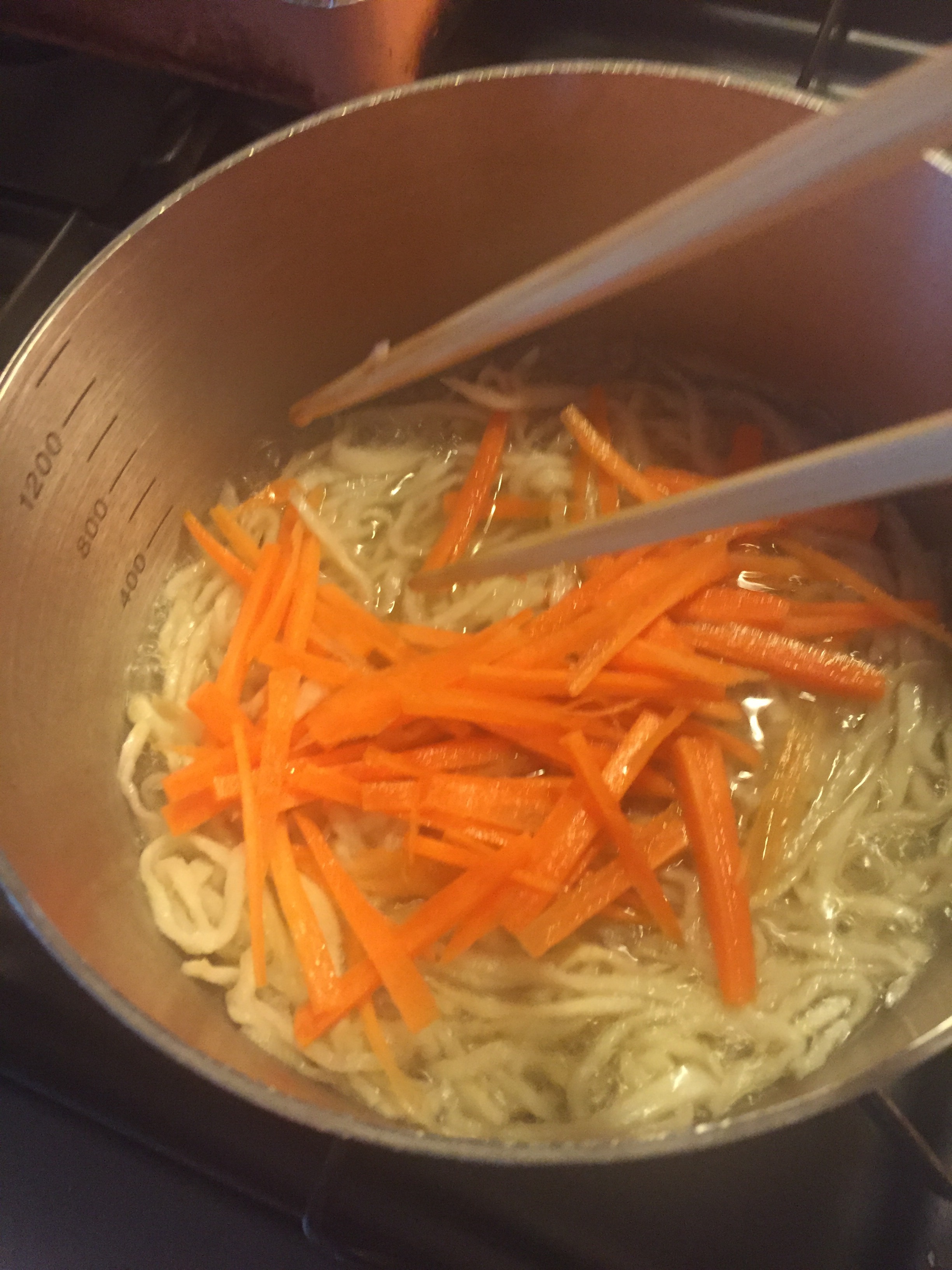 I forgot to buy it this time but you can also add thinly sliced “abura a-ge (油揚げ)“, deep fried sheets of tofu, after you add the carrots.