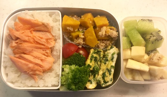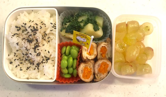Menu: Spinach goma-ae, simmered beef (dinner leftover), Okura/tofu/bonito flake salad, Boiled egg, Steamed broccoli