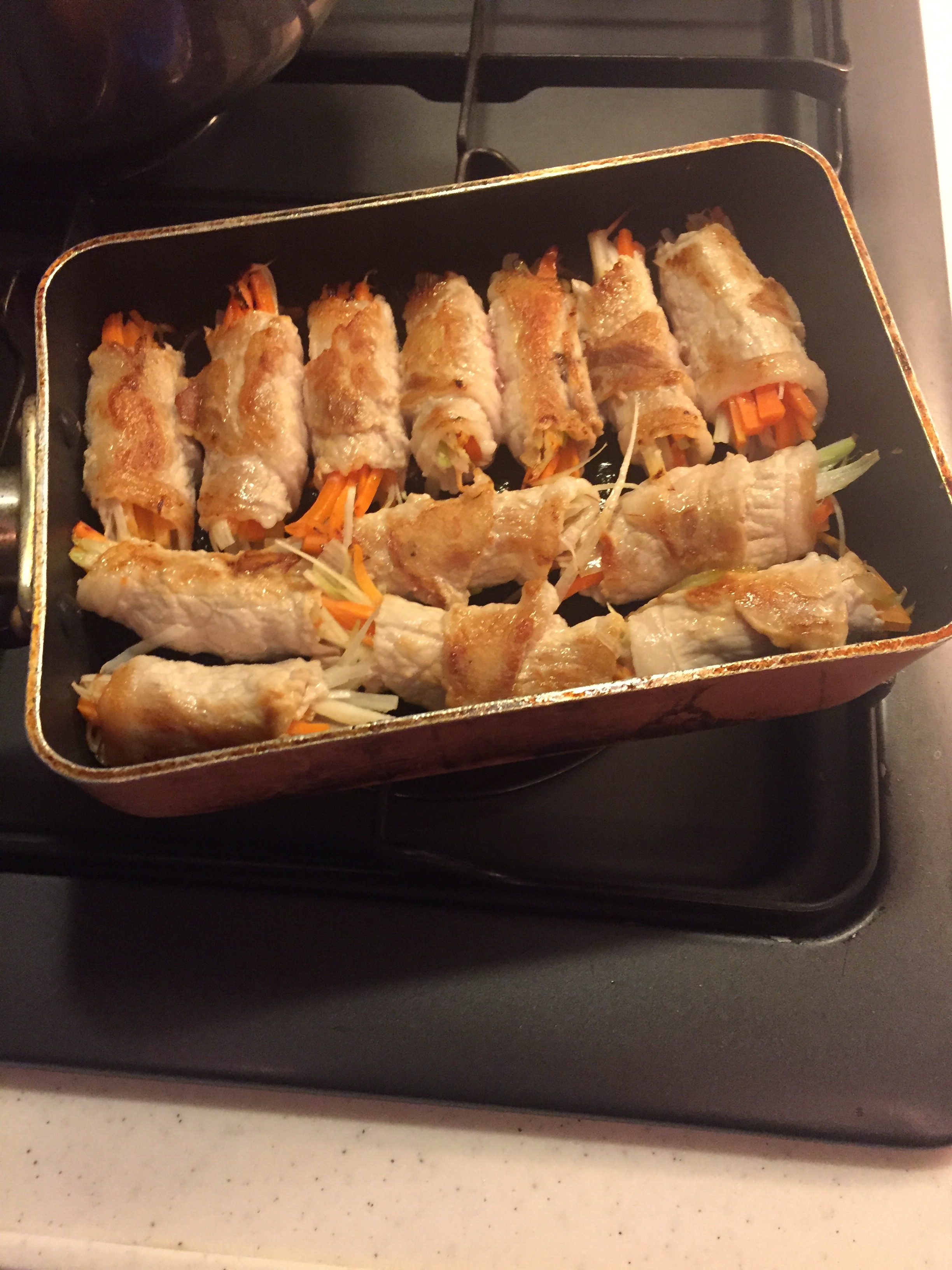 I usually boil spinach in boiling water (put the roots first for 10 seconds, push in the leaves afterwards and cook for a minute or so). Take the spinach out, place it under cold running water so that the boiled spinach maintains this beautiful bright green colour, and once cooled down, drain well by squeezing the water out of the spinach. Line them on a cutting board, cut into 4cm apart or so.