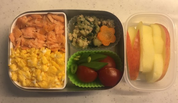 Menu: Chicken fillet & sautéed spinach, Pumpkin & boiled egg salad, cherry tomato, Nori & rice