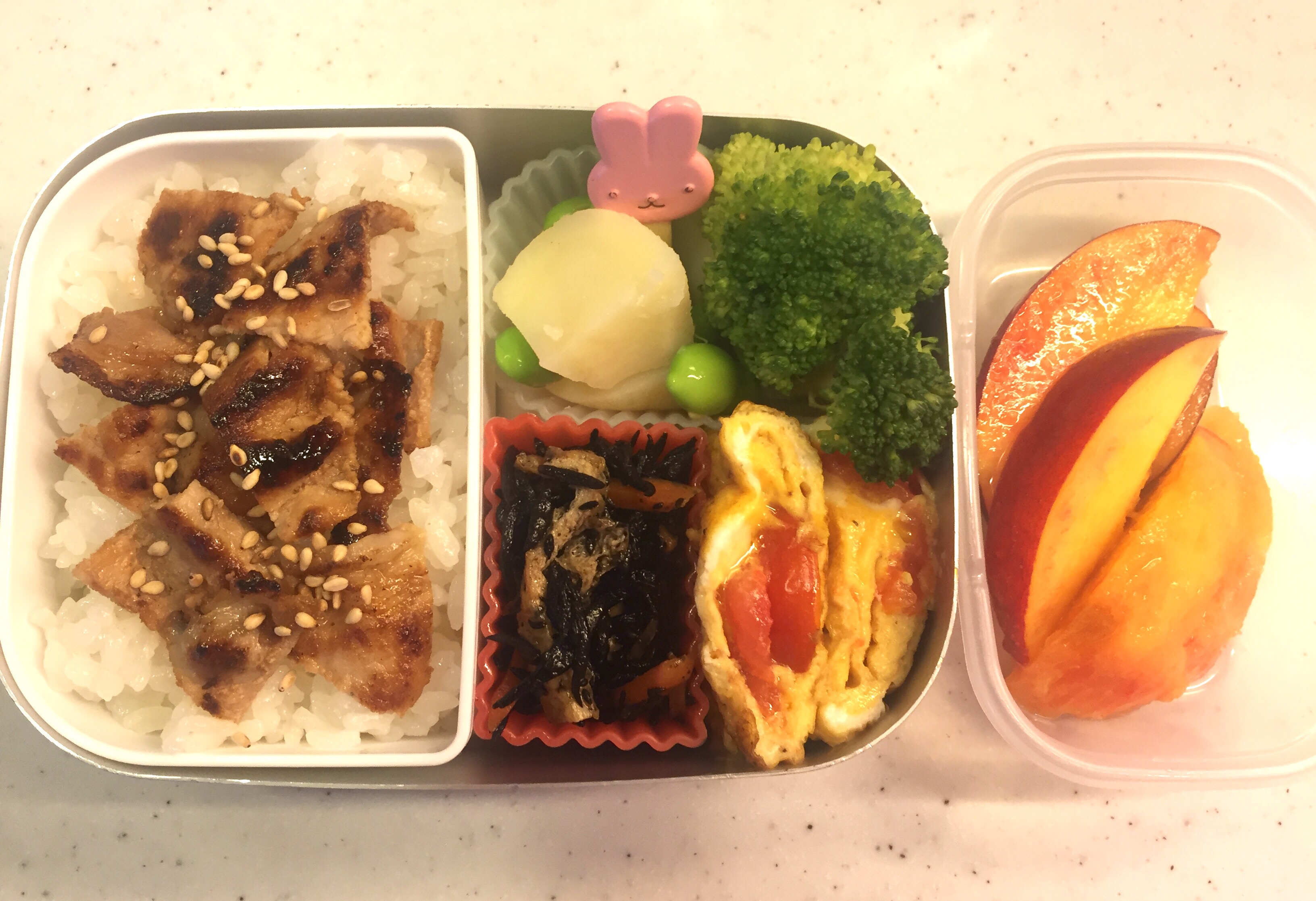 Menu: Niku-don, Hijiki, Tomato omelet, Steamed broccoli & potato, Edamame
