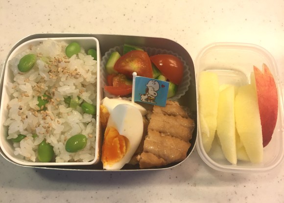 Menu: Edamame & jako rice, Spinach omelet, Bacon & green bean roll, Mased pumpkin and carrot combo, Goma-konbu