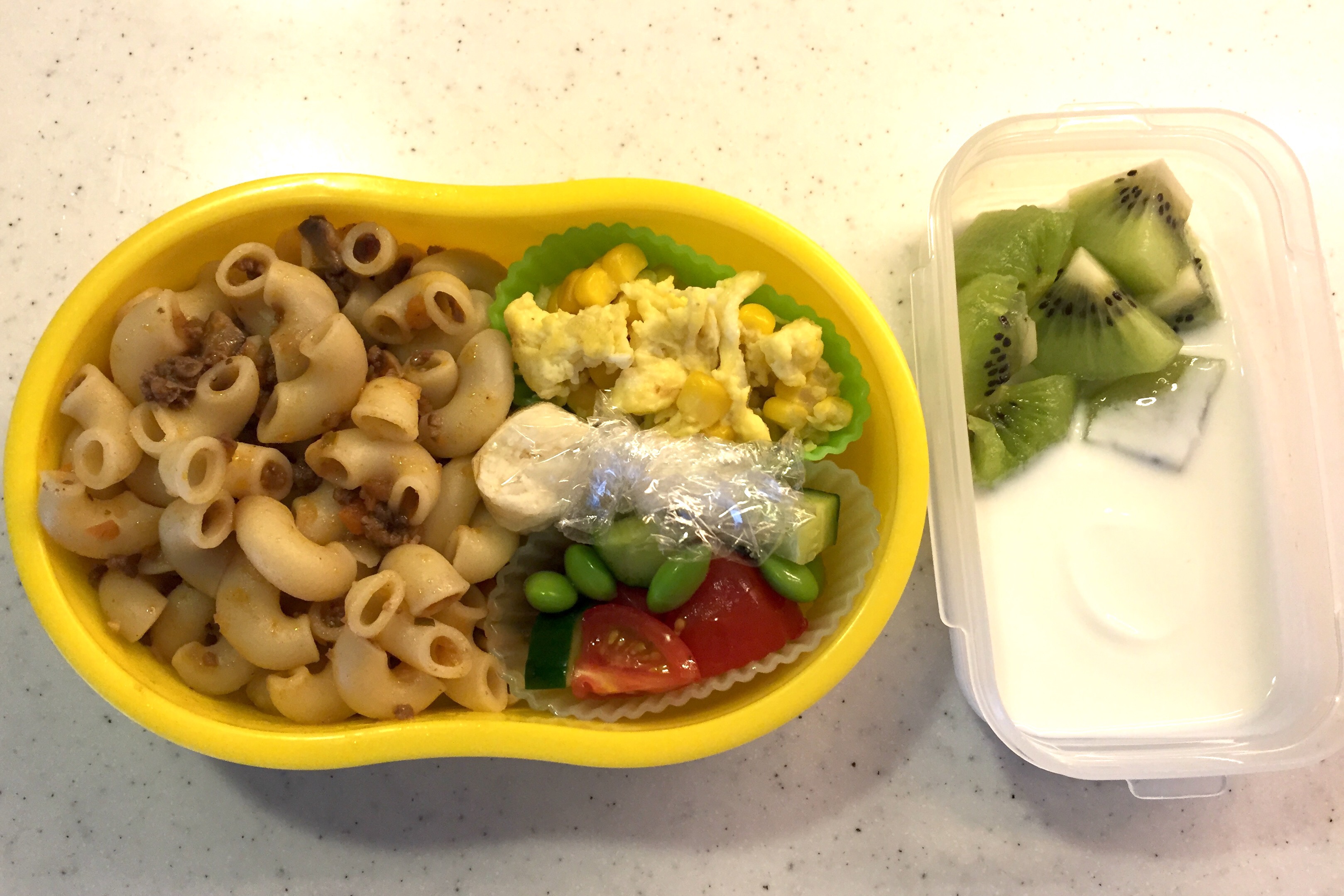 Menu: Macaroni bolognese (with parmiggiano), Scrambled egg with corns, Edamame, cucumber & tomato salad
