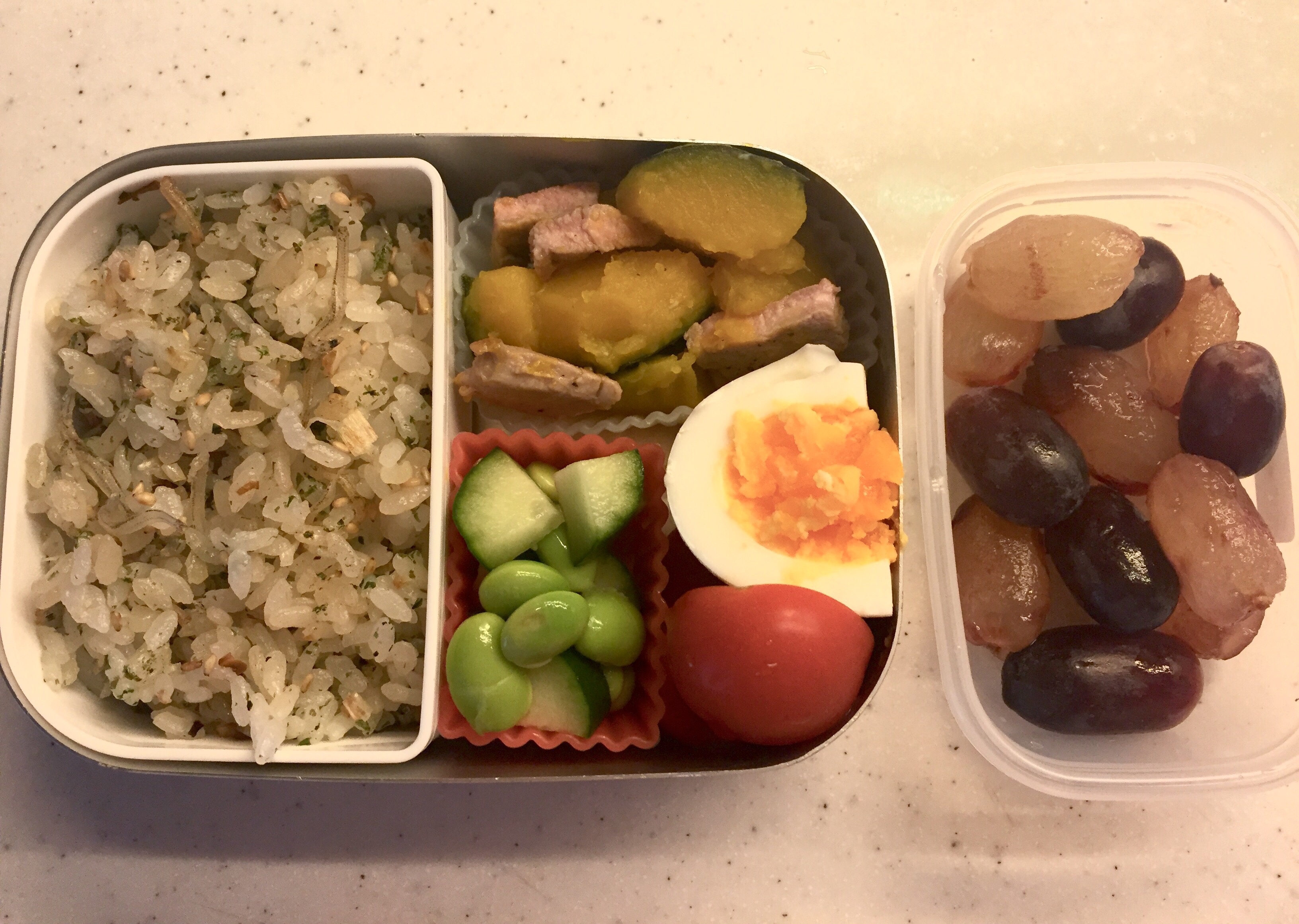 Menu: Fried rice (jako, spring onion & ‘aonori‘ seaweed powder), Pumpkin & sautéed veal slice, Cucumber & edamame salad, Boiled egg, Cherry tomato