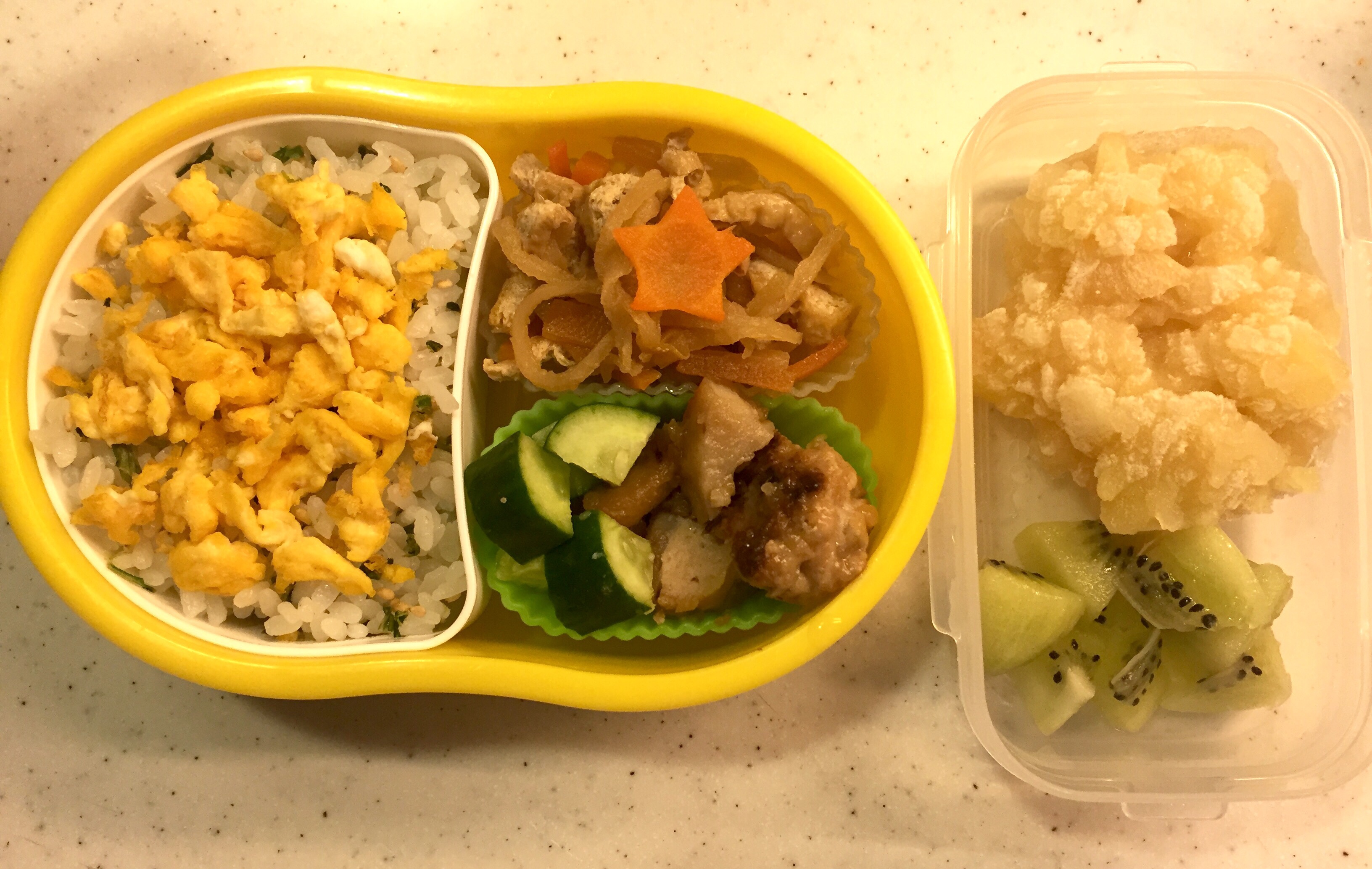 Menu: Leftover chicken burger, Kiriboshi daikon, Jako wakana rice with egg crumble on top, Diced cucumber