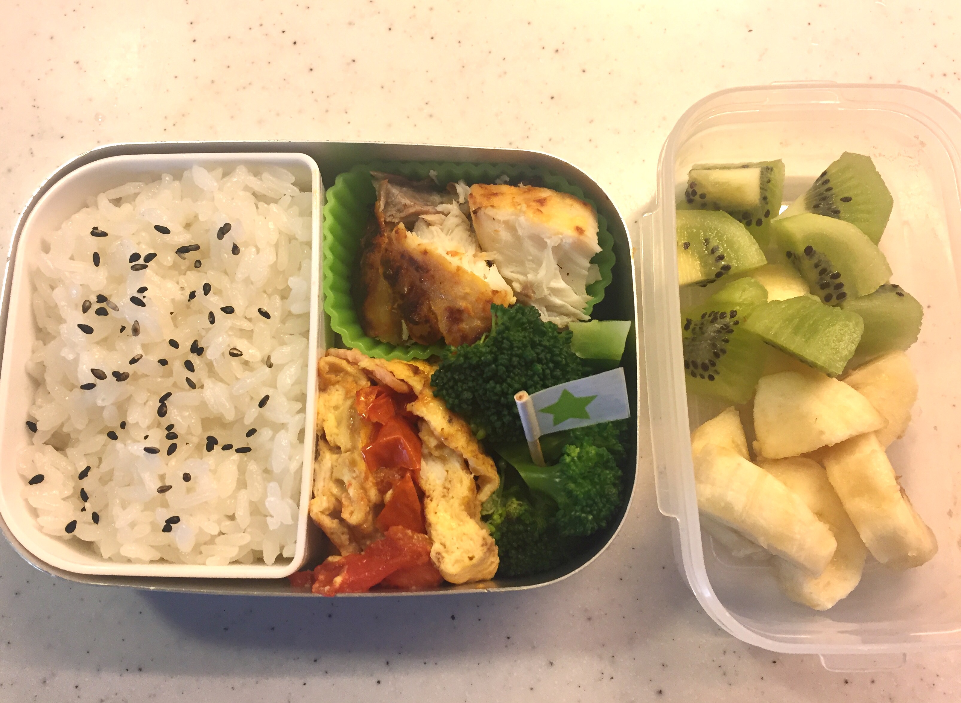 Kindergarten bento – Marinated snapper (20/Oct/16) 20/10/2016 Menu: Grilled marinated snapper, Tomato/ham/cheese omelet, Boiled broccoli, Rice with goma-shio (black sesame & salt sprinkle) Kiwi and banana for dessert Share this:Share Click to share on Facebook (Opens in new window) Facebook Click to share on Pinterest (Opens in new window) Pinterest Like Loading...