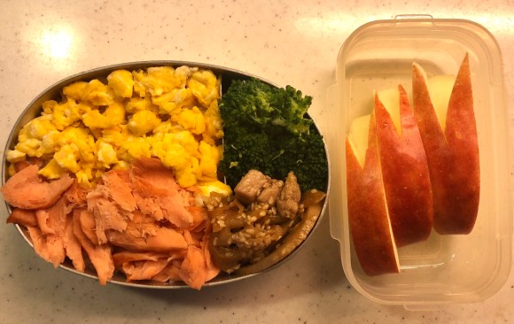 For the first time, I packed mashed potato in lieu of rice for our daughter’s bento today. All the dishes in the bento are the leftover from the previous evening’s dinner, except for the boiled egg.