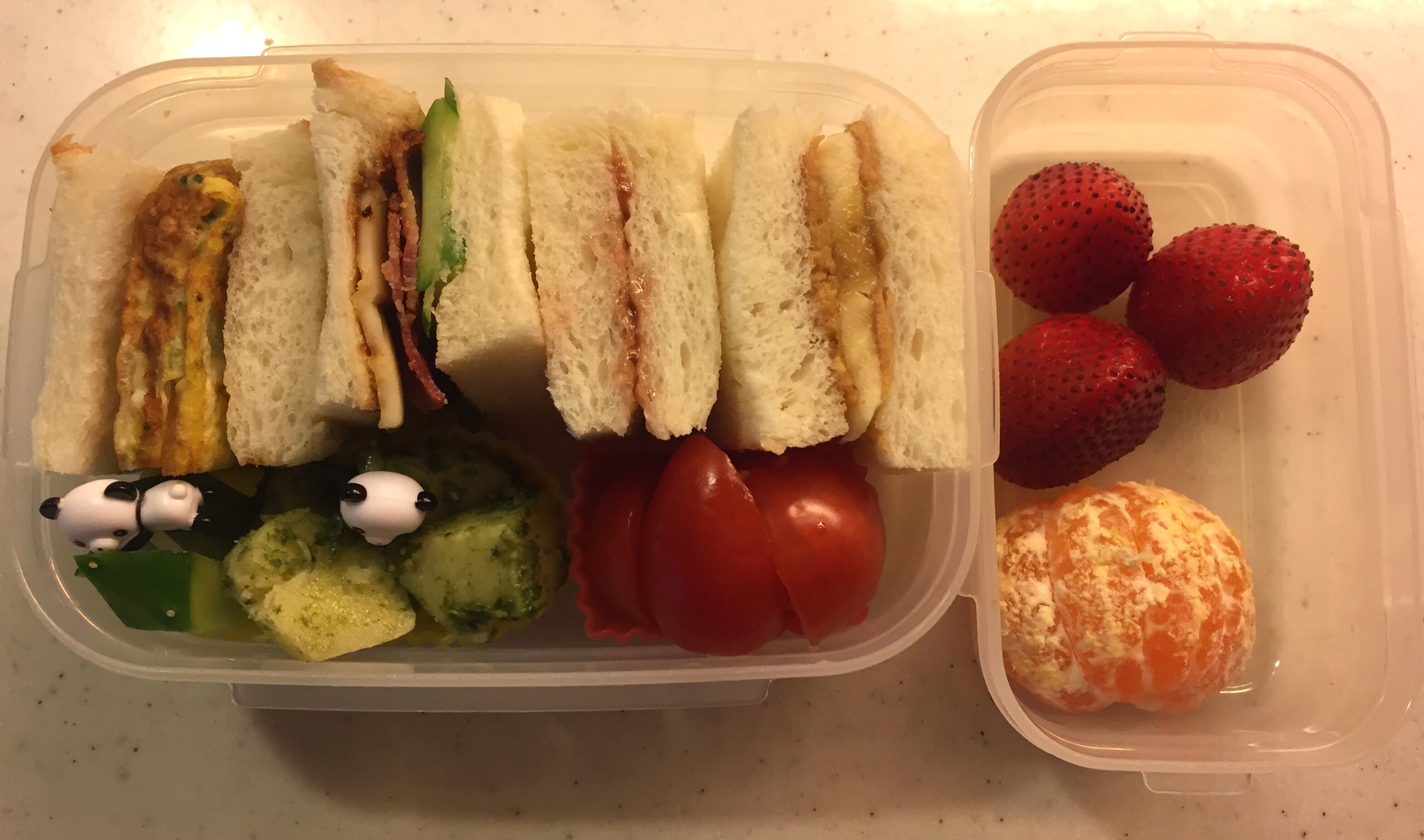 Coming home, she told me that she had diligently followed my instruction by starting off with savory cheese sandwich, moving on to ham & cucumber, then to peanut butter & jam, and finally finishing it off with Nutella.