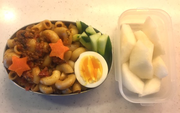 Menu: Macaroni bolognese (steamed carrot slices on top), Cucumber sticks, Boiled egg