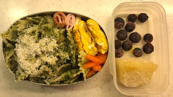 In the car back from the airport, I quickly assessed in my head what was left in our fridge/freezer for our daughter’s bento the next morning. I remembered about the pesto sauce in the freezer I had made a couple of weeks ago, as well as the frozen steamed carrot slices, blueberries and apple mousse. I also remembered the eggs & ham in the fridge hadn’t gone expired yet. And the outcome was a not so bad pasta bento for our little girl.