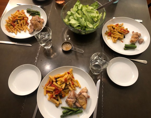 Wednesday: Tomato & aubergine pasta, sautéed chicken with asparagus