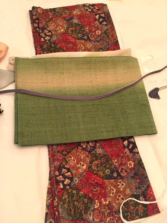 It was a perfect excuse for me to wear my spring green kimono, with a gorgeous pastel phenix pattern obi handed down from my mum. The ceremony was to start at 10:00AM sharp, and based on my numerous practices with my kimono teacher, I timed it and decided to wake up at 6:30AM. The first thing to do is to put my make up on and my hair up before I start touching the valuable kimono (actually it’s a must, to do these preparations in advance, because we hardly ever “wash” this type of kimono/obi. It’s made of silk, and the contact with any liquid could ruin the fabric. If it gets dirty for whatever reason, we seek professional help, which of course comes with a bill). I was planning to leave our sleeping beauty in bed as long as possible in order to secure ample time to put kimono on, after grabbing a quick bite to eat for breakfast… But don’t things always turn out to be different from what you expected? As ironic as life is, only five minutes after I woke up I heard the click of our daughter’s bedroom door, only to find this cute little exciting face peeking out, already super active, and claiming determinedly, “Hungry!!!” So still in our pj’s and with my unwashed face and messy hair, we had breakfast, along with a grumpy sleepy Papa.