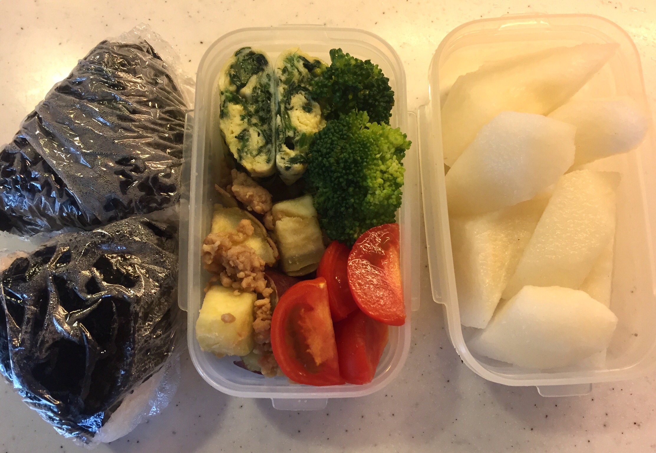 Menu: Onigiri balls (grilled salmon & goma-konbu), Spinach omelet, Steamed broccoli, Cherry tomato