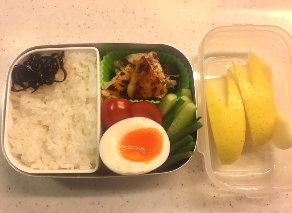 Menu: Kajiki nimono (simmered sword fish), Cucumber sticks, Sautéed spinach & bacon, Cherry tomato, Boiled egg