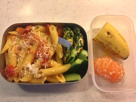 Menu: Sandwich (bacon/cucumber/cheese & appelstroop, Broccoli omelet, Peanut butter & banana, Strawberry jam), Cherry tomato, Cucumber sticks, Leftover potato in pesto sauce