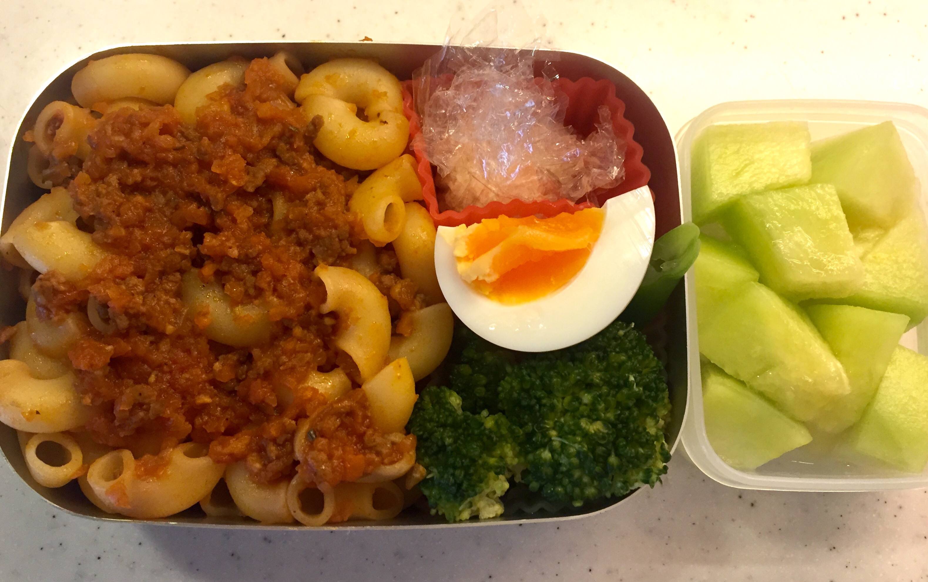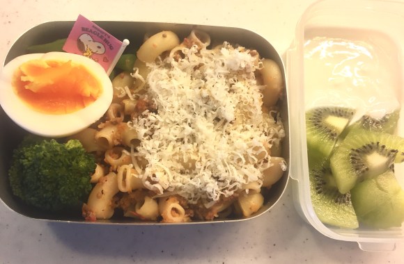 To be honest I prefer putting the cheese separately so that the amount of cheese can be adjusted as I eat. Like mother, like daughter, our four year old also likes to have a control over this kind of thing. At home she loves scooping the fine powdery cheese with a small spoon and sprinkle it as she shakes her entire body. And naturally, once for our daughter’s bento, I put the grated cheese in a plastic wrap, twisted the top and placed it on the side of the pasta, expecting her to enjoy sprinkling the cheese by herself as she ate. But according to Miss N, a disaster apparently happened that day. Our girl’s clumsy fingers bursted the plastic wrap open, spreading the whole grated parmiggiano around her neighborhood… Miss N told me that day as a matter of factly that the school, focusing highly on building up children’s self-confidence, believes that the cheese should be pre-sprinkled on top of the pasta going forward. As diligent as I am… voila! The cheese, is now on top of the pasta.