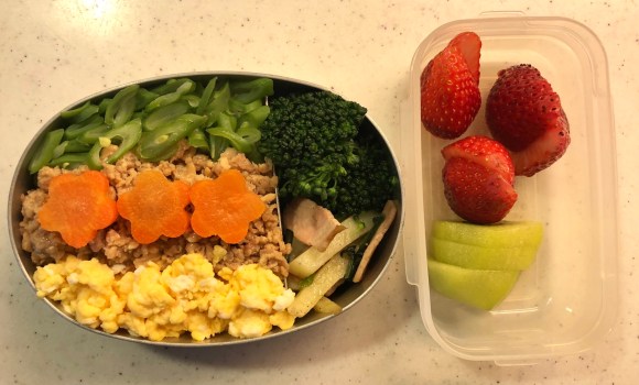 In the car back from the airport, I quickly assessed in my head what was left in our fridge/freezer for our daughter’s bento the next morning. I remembered about the pesto sauce in the freezer I had made a couple of weeks ago, as well as the frozen steamed carrot slices, blueberries and apple mousse. I also remembered the eggs & ham in the fridge hadn’t gone expired yet. And the outcome was a not so bad pasta bento for our little girl.