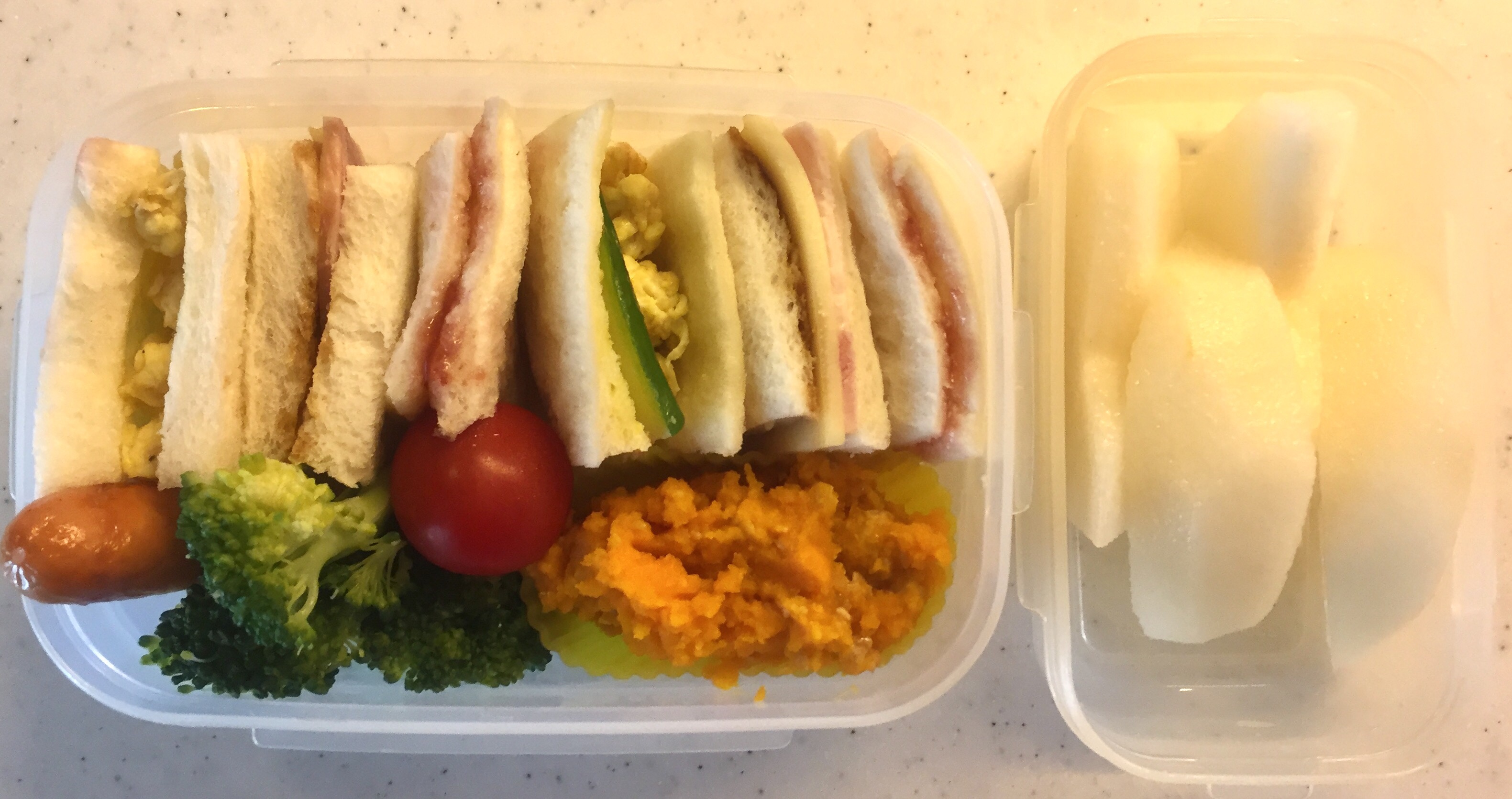 Coming home, she told me that she had diligently followed my instruction by starting off with savory cheese sandwich, moving on to ham & cucumber, then to peanut butter & jam, and finally finishing it off with Nutella.