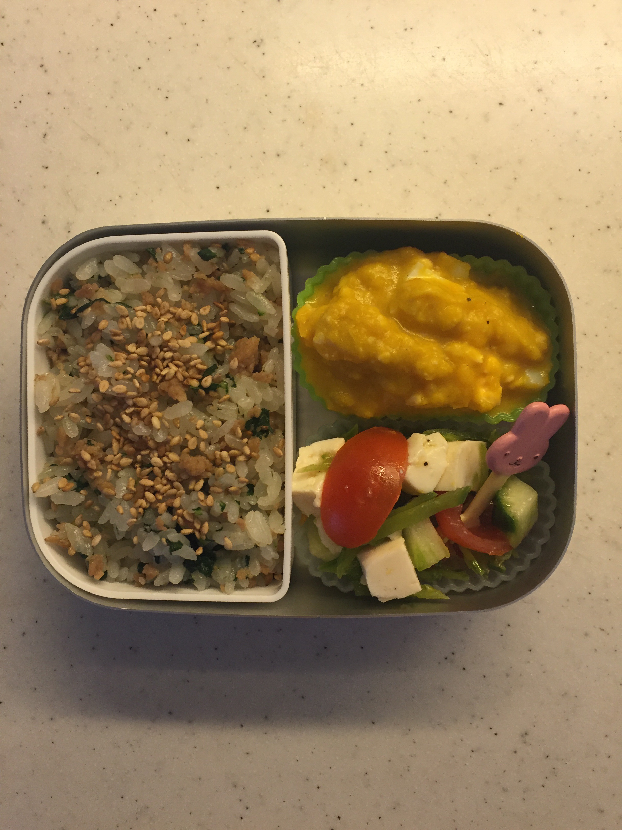 Chicken soboro, chopped komstsuna, rice, sesame, tomato omelet, broccoli, cucumber with bonito flakes, watermelon