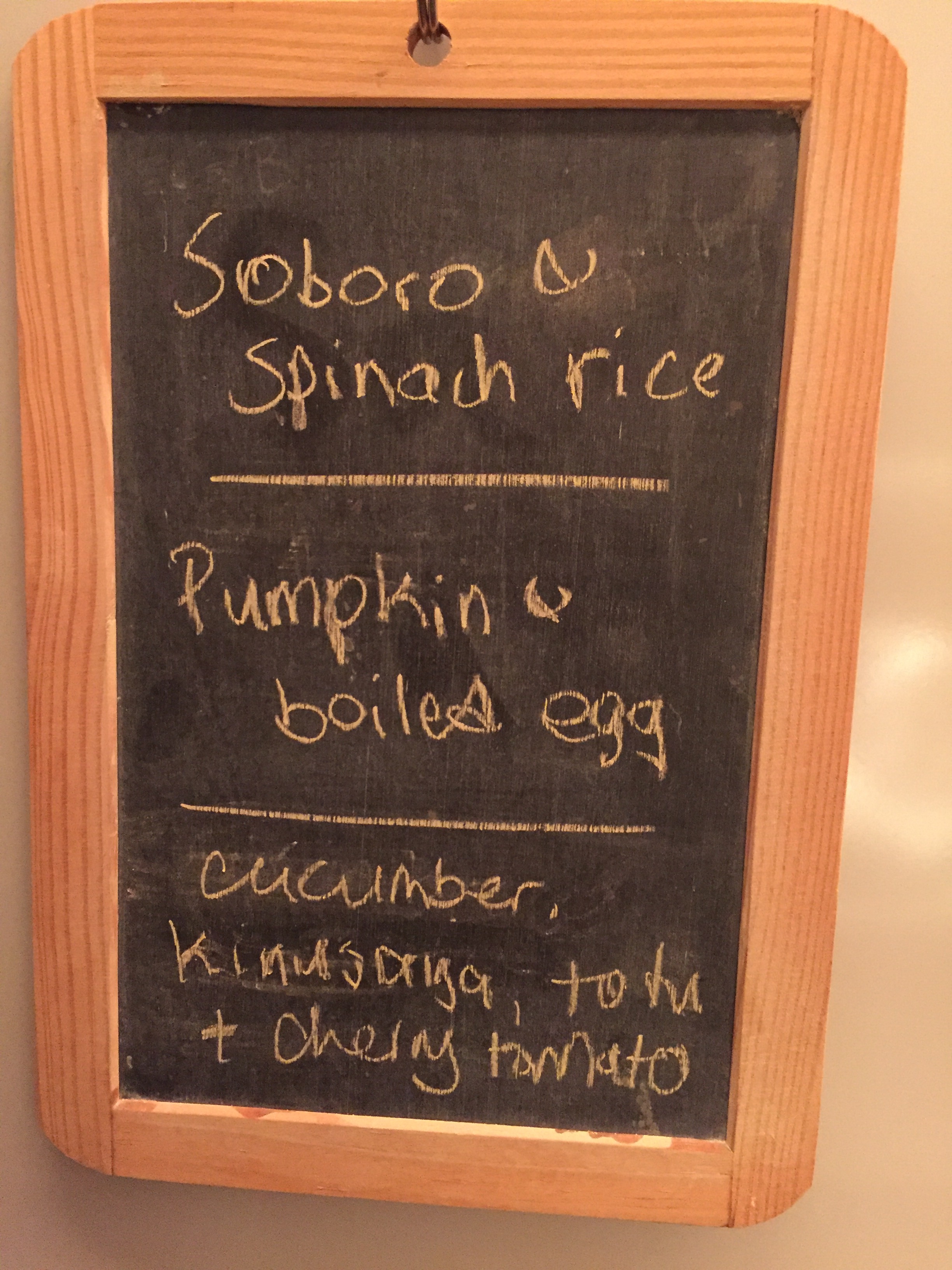 Simmered cod, rice, edamame, egg with corns, spinach in sesame sauce, cucumber, carrot, apple, banana
