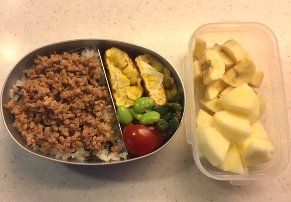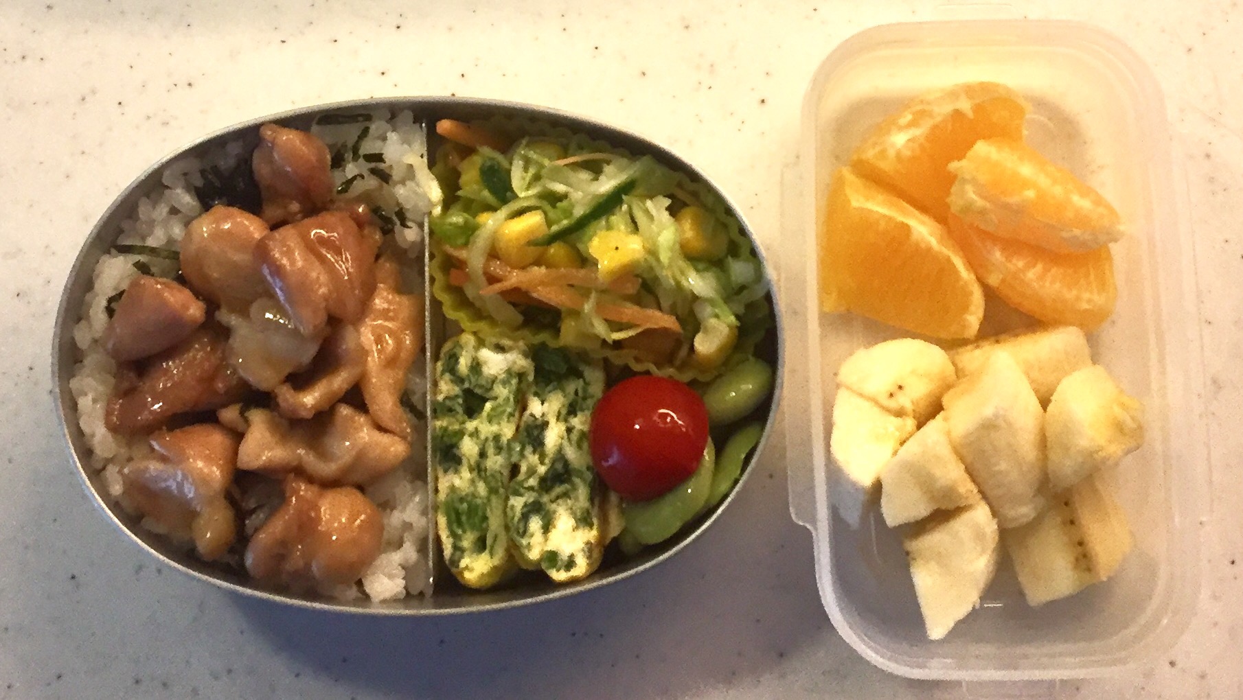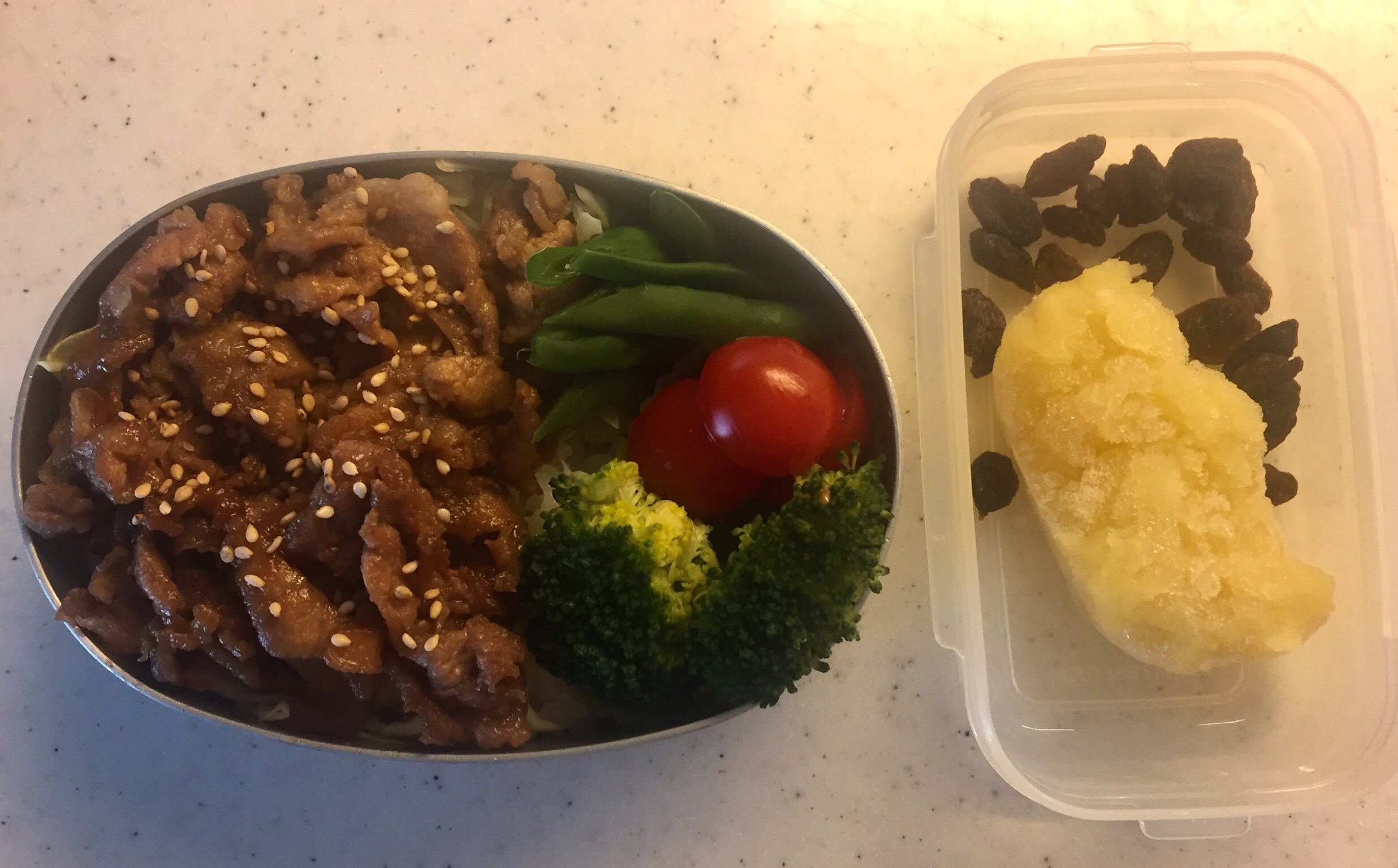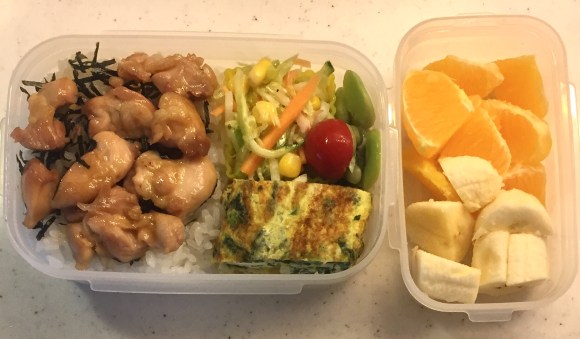 Well, it takes about three minutes to make this yakitori-don if you already have your rice ready. I bought pre-cut chicken thigh (guilt), don’t even have to marinate it (another guilt), stir-fry it and quickly season at the end. Voila, it’s done (within three minutes). I just boiled egg rather than make omelet (guilt), packed it with unseasoned vegetables (guilt). On top of this, I packed frozen apple mousse and mashed sweet potato from the freezer for dessert (see, I am now officially guilty).