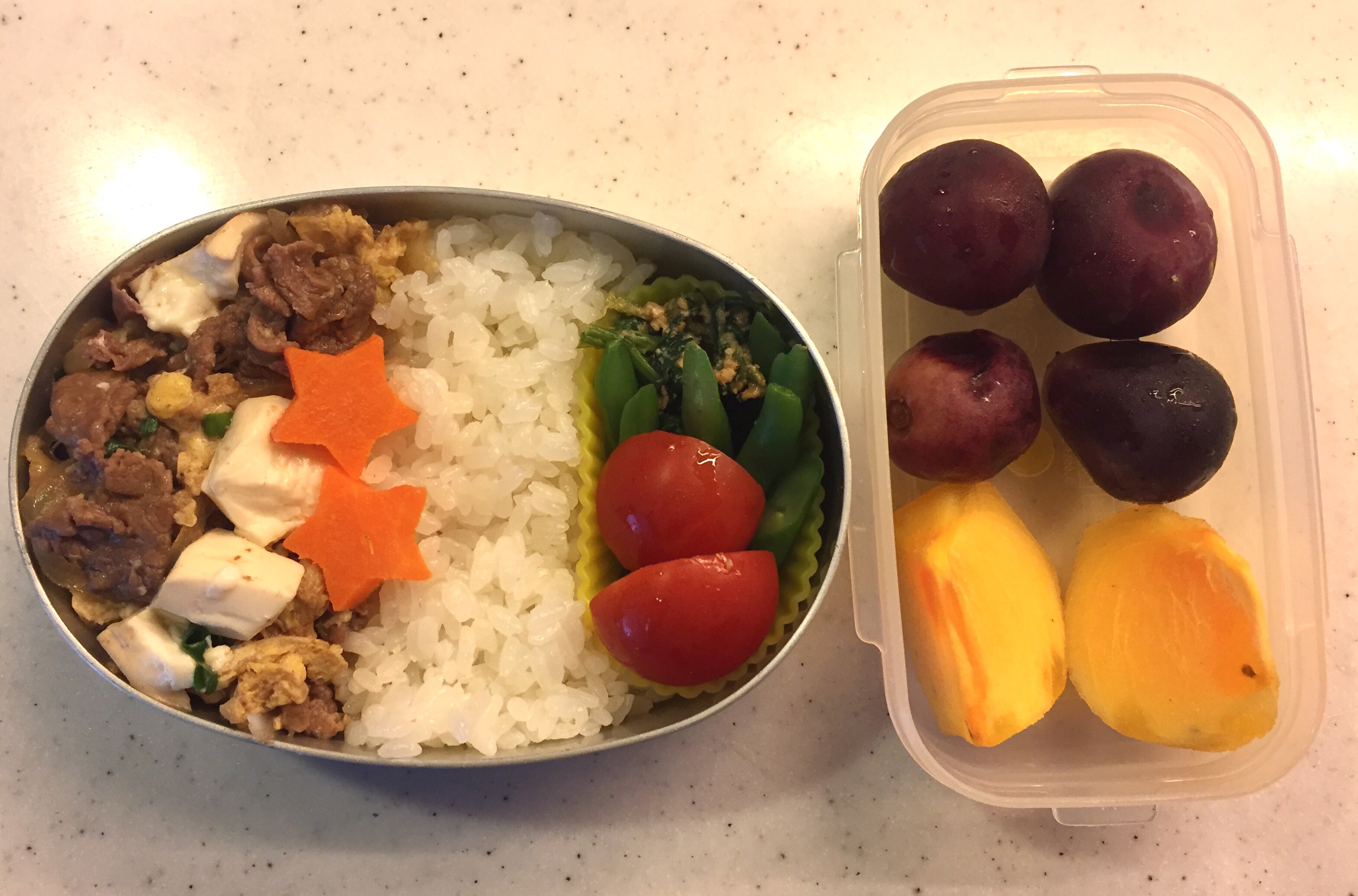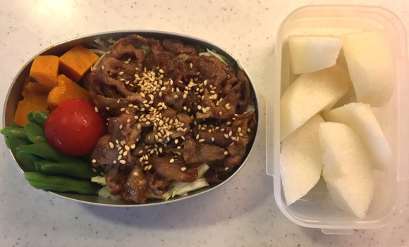 Menu: Mum’s nikudon, Steamed pumpkin, Boiled green beans, Cherry tomato