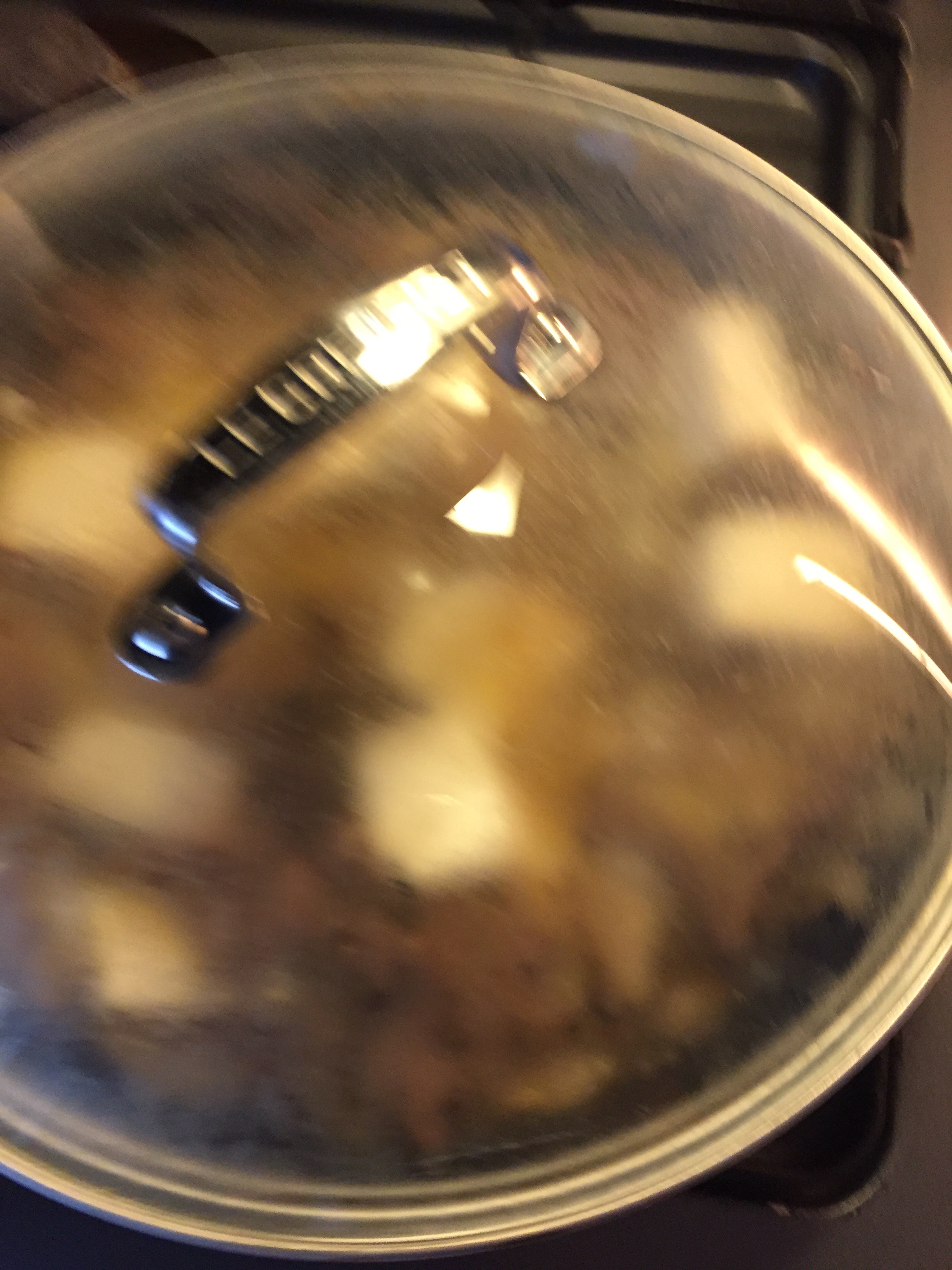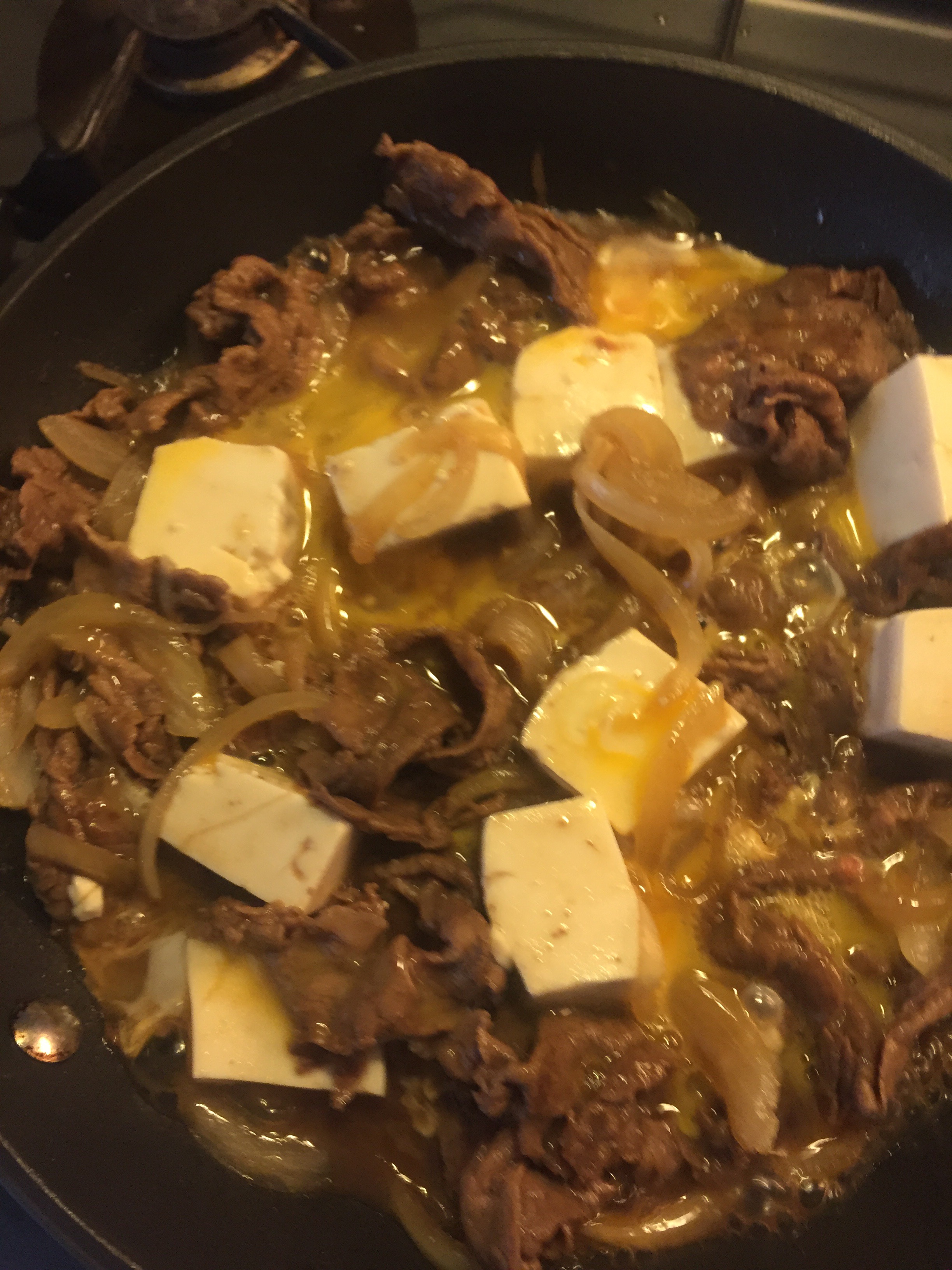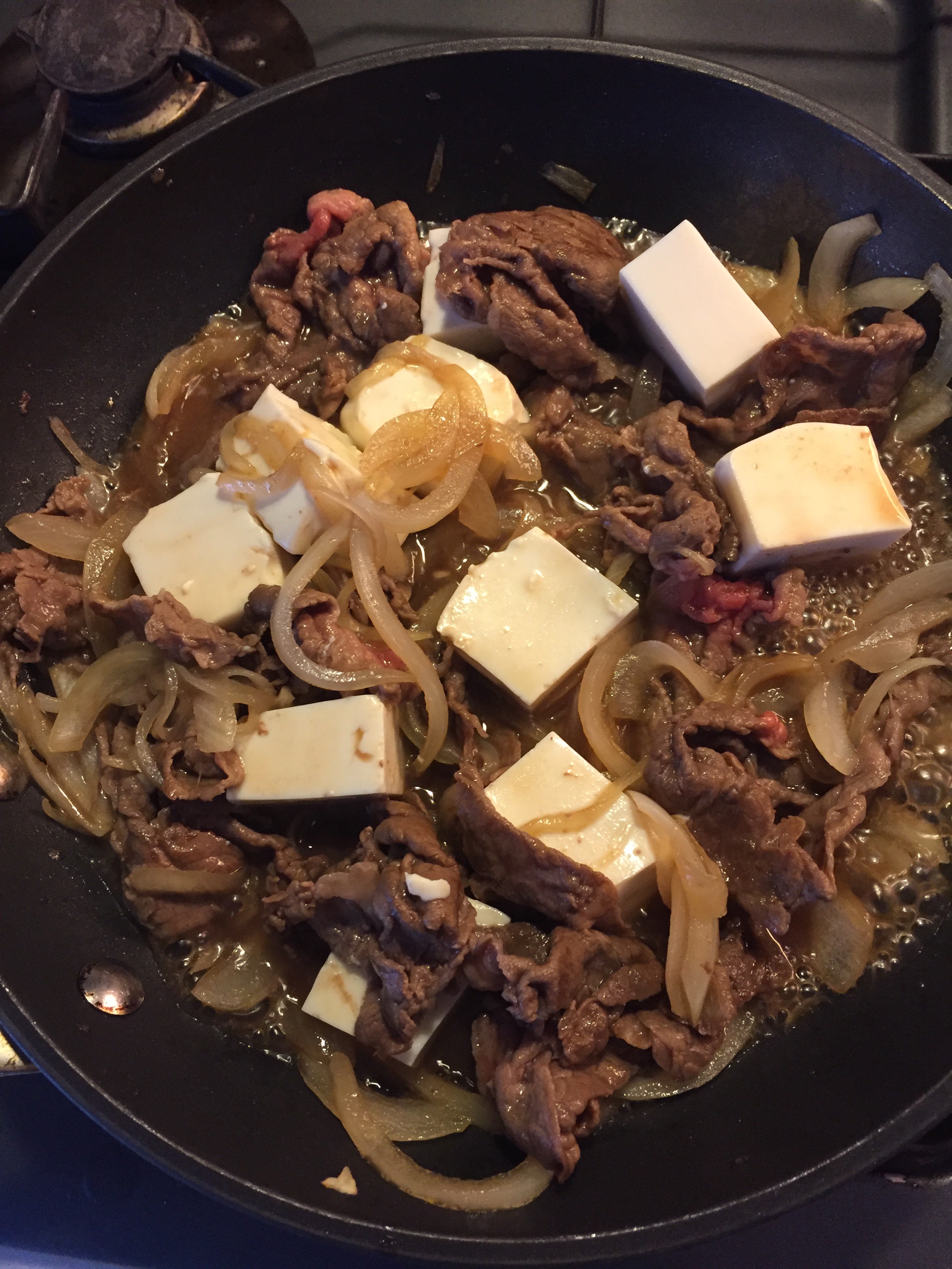 3) When the beef starts to brown, still reddish on the edges, add the Sukiyaki sauce mixture (1 table spoon each of sake & soy sauce, 3+ table spoons of mirin) and bring it to boil