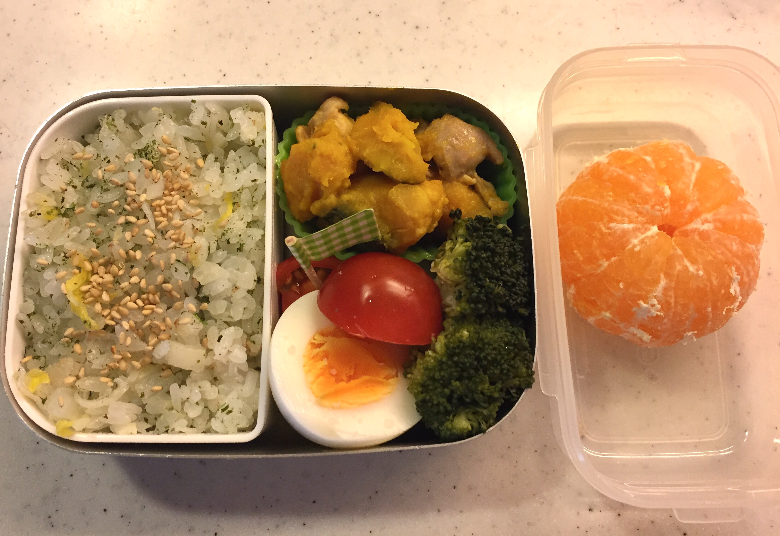 Menu: Simmered pumpkin & chicken, Fried rice with Japanese hakusai cabbage and shirasu baby sardines, Boiled egg, Boiled broccoli, Cherry tomato