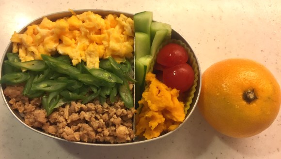 In the car back from the airport, I quickly assessed in my head what was left in our fridge/freezer for our daughter’s bento the next morning. I remembered about the pesto sauce in the freezer I had made a couple of weeks ago, as well as the frozen steamed carrot slices, blueberries and apple mousse. I also remembered the eggs & ham in the fridge hadn’t gone expired yet. And the outcome was a not so bad pasta bento for our little girl.