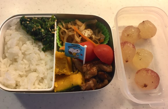 Simmered cod, rice, edamame, egg with corns, spinach in sesame sauce, cucumber, carrot, apple, banana