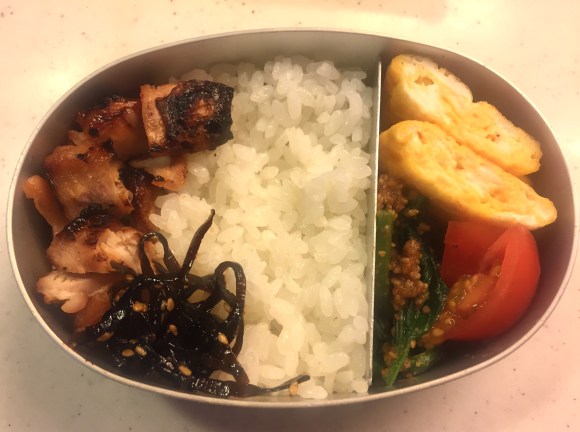 Chicken soboro, chopped komstsuna, rice, sesame, tomato omelet, broccoli, cucumber with bonito flakes, watermelon