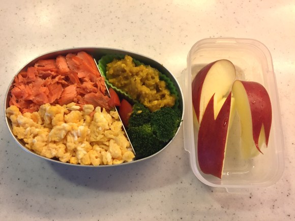 Menu: Grilled salmon flakes & scrambled egg on rice, Mashed pumpkin & sweet potato with chicken soboro, Steamed broccoli, Cherry tomato