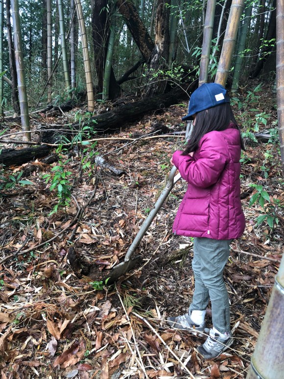 For the past few years in every May, we visit my aunt & uncle who live in the mountains for Takenoko diggings. After climbing up the ladder on their retaining wall to get to the bamboo grove behind their beautiful wooden house, we avidly started searching for the little shoots peeking out of the fertile soil. It is my daughter’s third time this year, and she appeared to be confident and know exactly what to do with the large spade.