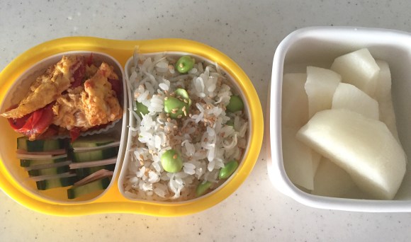 Menu: Edamame rice, Tomato omelet, Baba ham kyuri