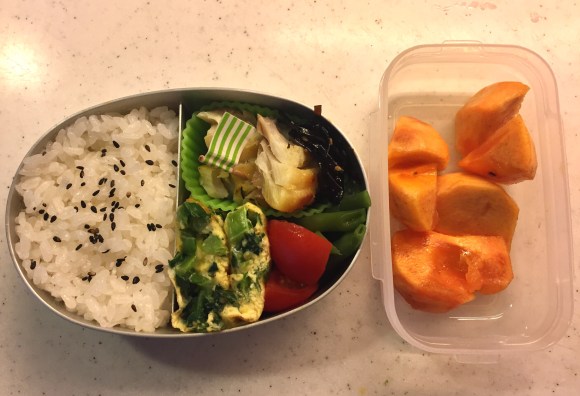 Chicken soboro, chopped komstsuna, rice, sesame, tomato omelet, broccoli, cucumber with bonito flakes, watermelon