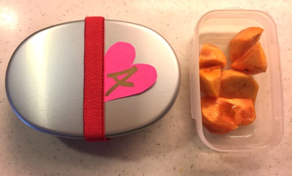 Tortillas (counted as one), ham, cucumber, cheese, Dutch appelstroop, strawberry jam, banana with Nutella (secret, as it’s not allowed at her school), boiled egg, broccoli, watermelon