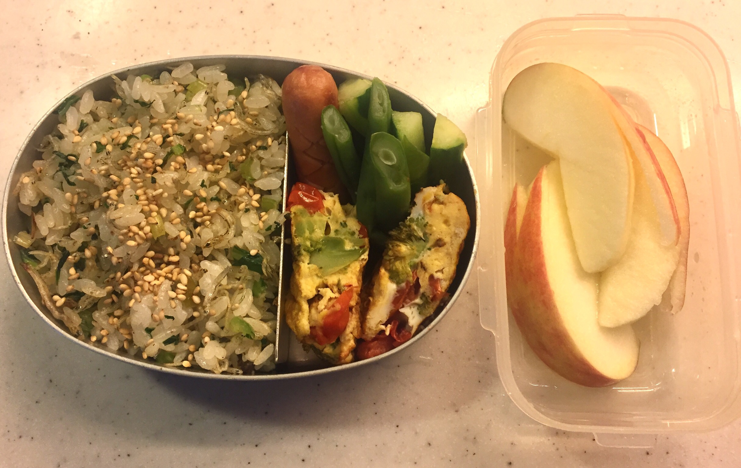 Fried chicken (with corn flower), green beans, broccoli, cherry tomato, goma konbu (sesame & kelp), rice, furikake sprinkle (counted as one), apple, strawberry