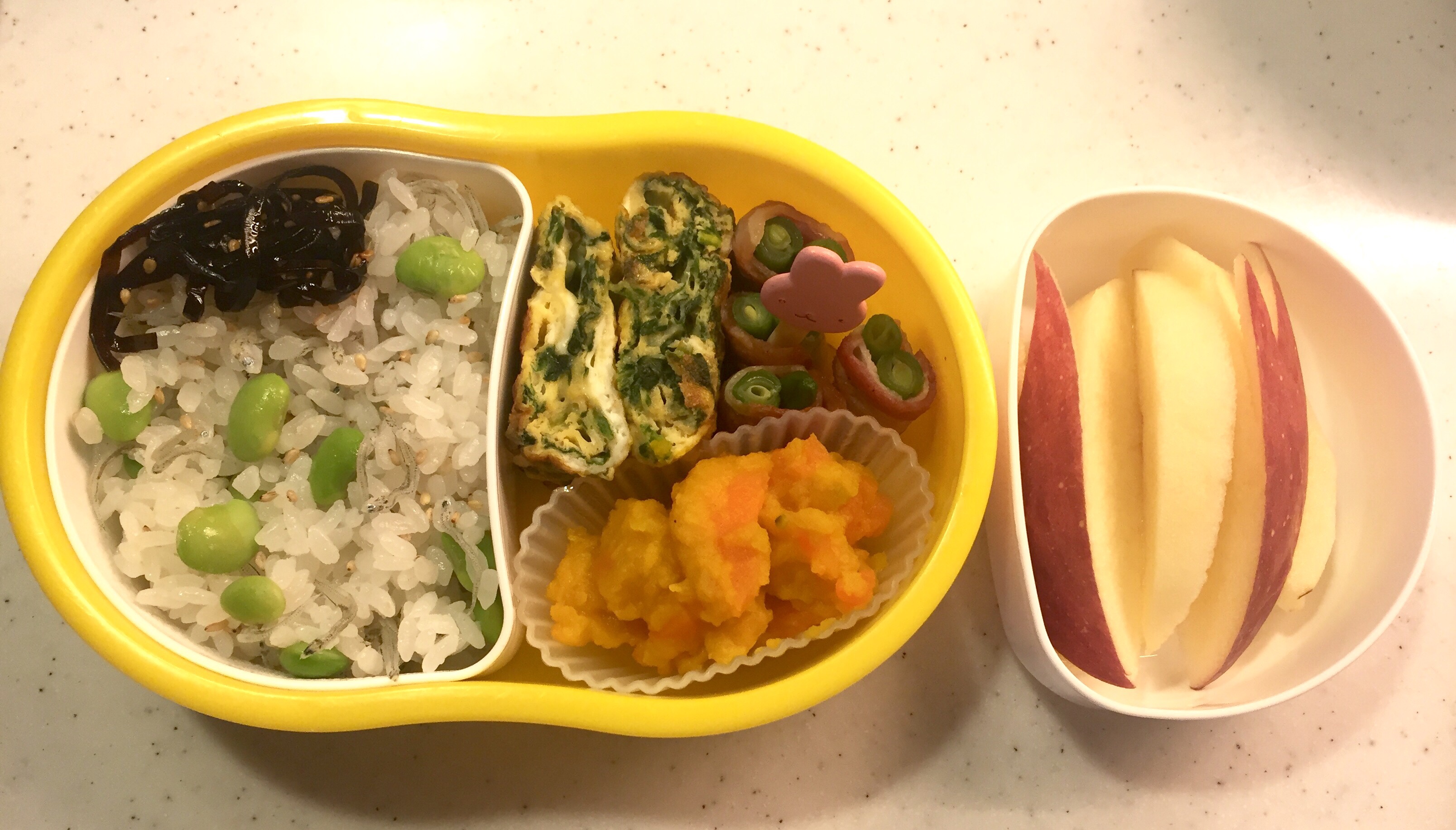Menu: Edamame & jako rice, Spinach omelet, Bacon & green bean roll, Mased pumpkin and carrot combo, Goma-konbu