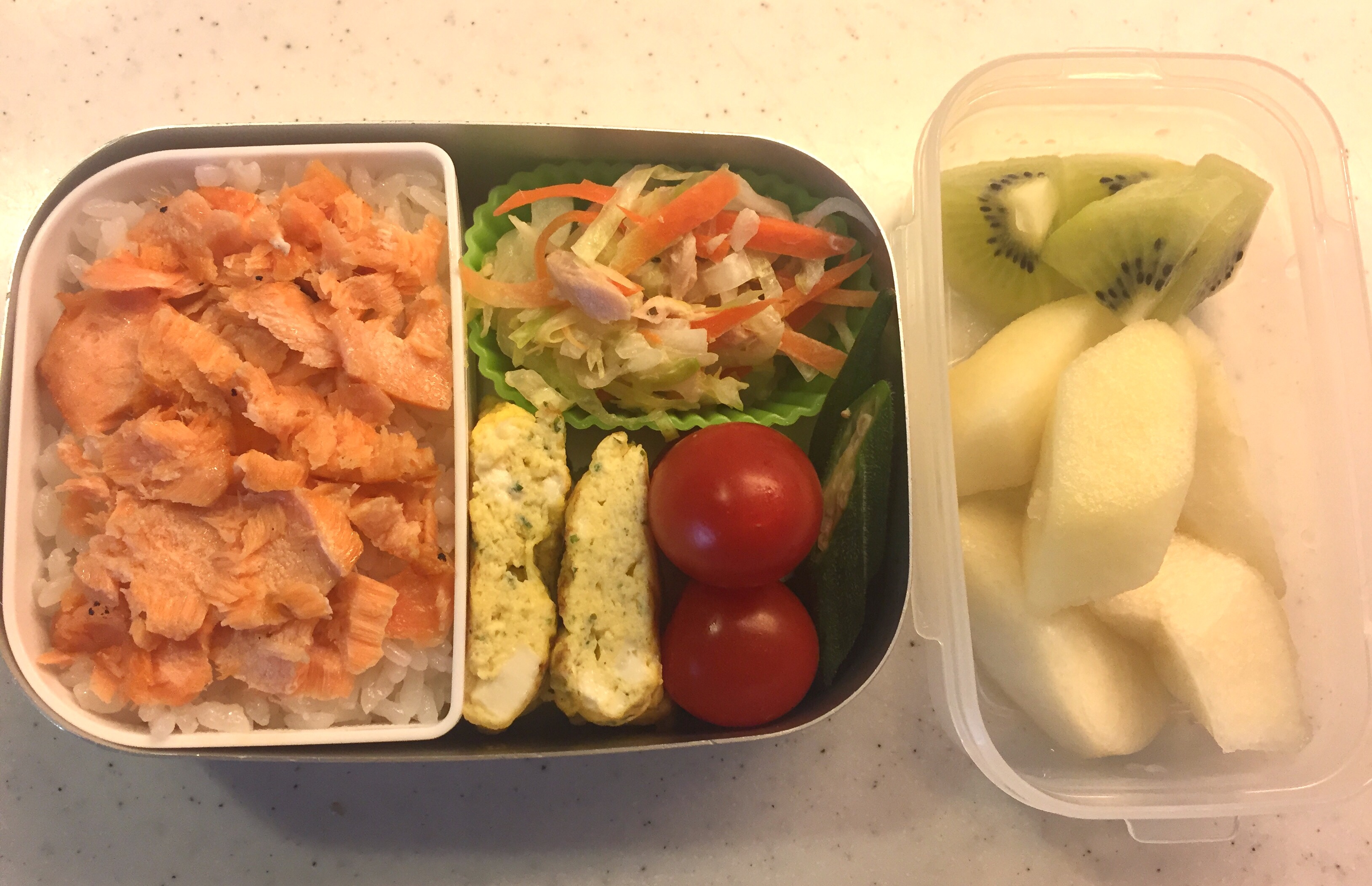 Menu: Grilled salmon on rice, Tofu & seaweed powder omelet, Cabbage & tuna salad, Boiled okura, Cherry tomatoes