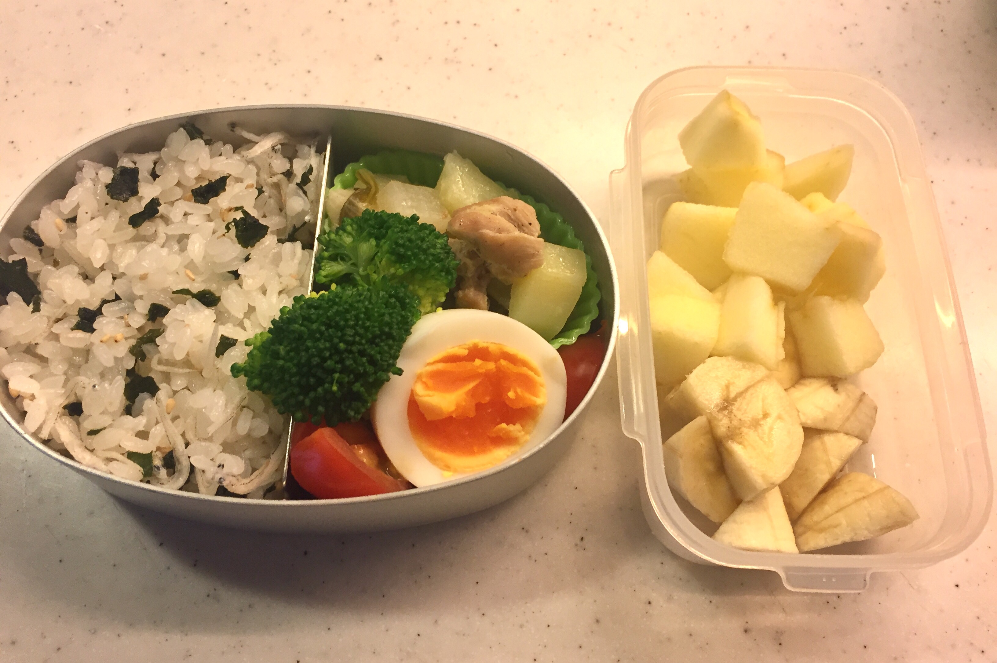 Menu: Wakame rice (with jako fish & sesame), Stewed veggies & chicken, Boiled broccoli, Boiled egg, Cherry tomato