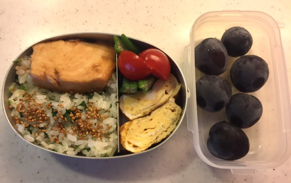 Menu: Simmered sword fish, Omelet, Boiled okra, Cherry tomato, Chopped boiled spinach mixed in rice