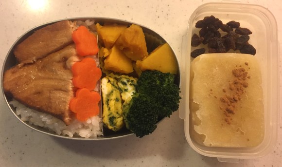 Menu: Simmered sword fish, Simmered pumpkin, Spinach omelet, Steamed broccoli, Steamed carrot, Rice