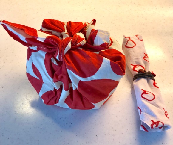 * Furoshiki is this square shaped cotton fabric that is used for wrapping almost anything, mainly for transportation. In Japan it is quite common to wrap a gift with it, to protect the gift from bumps as well as to conceal what’s in it.