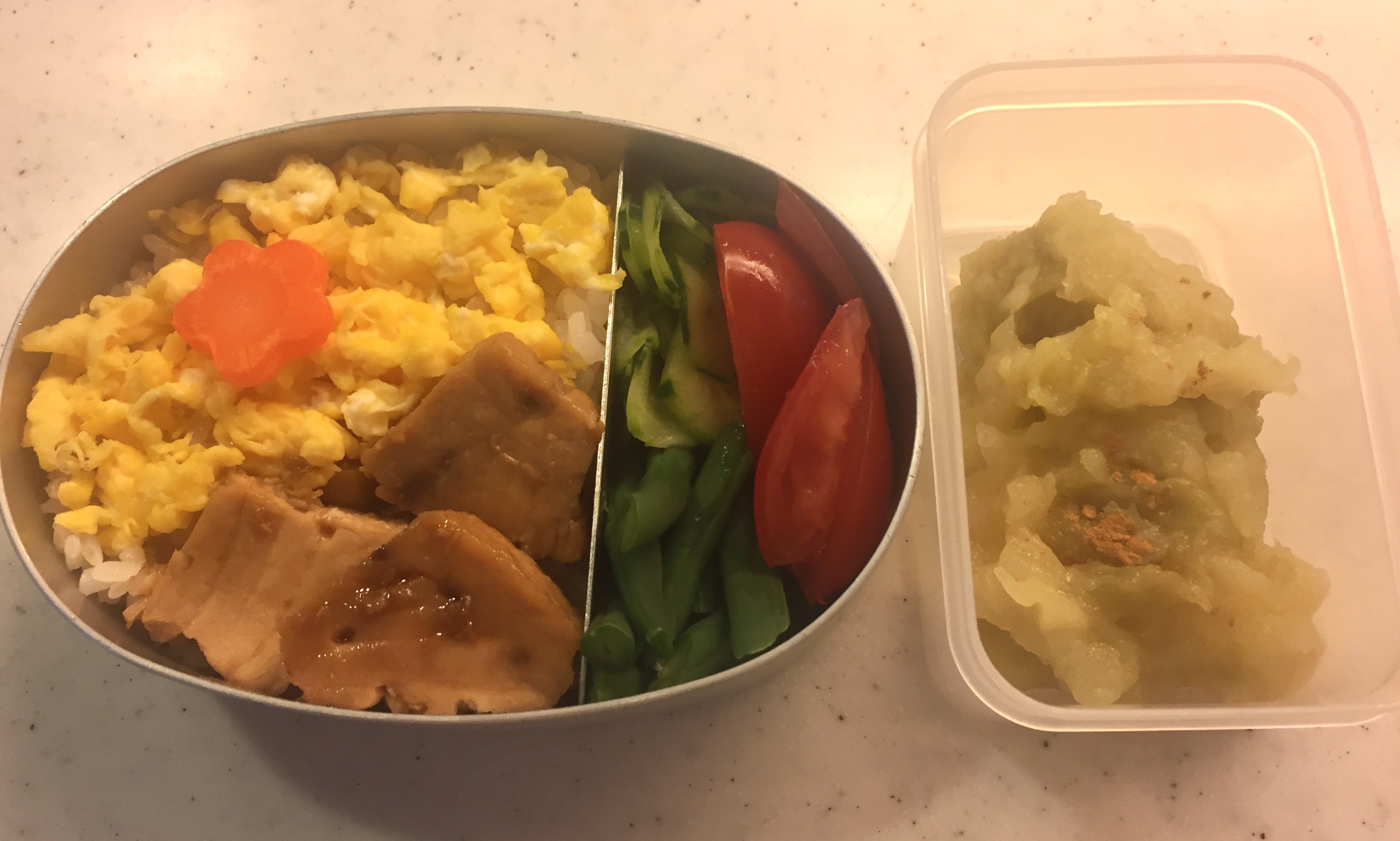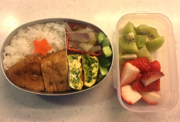 With or without pain, bento making continues. I generally enjoy cooking bento for my daughter, but at times, especially now with the sharp pain in my back, I wish there was an alternative. I wonder if they (her school) judge me if I just put store bought bento in her backpack… In Japan we have unspoken rules everywhere, and where homemade bento is required such as at her kindergarten, it just has to be homemade bento no matter how simple it is. Also, I’m so used to making bento with different ingredients and colours I don’t know how to make them simpler and not let my daughter down too much at the same time.