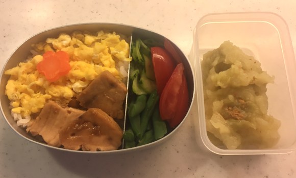 Menu: Kajiki sword fish nimono, Boiled green beans, Sliced cucumber salad, Cherry tomato, Rice with scrambled egg on top