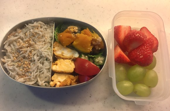 Menu: Steamed pumpkin & chicken soboro, Omelet, Tomato, Boiled okra, Wakana rice with shirasu (baby sardine) on too
